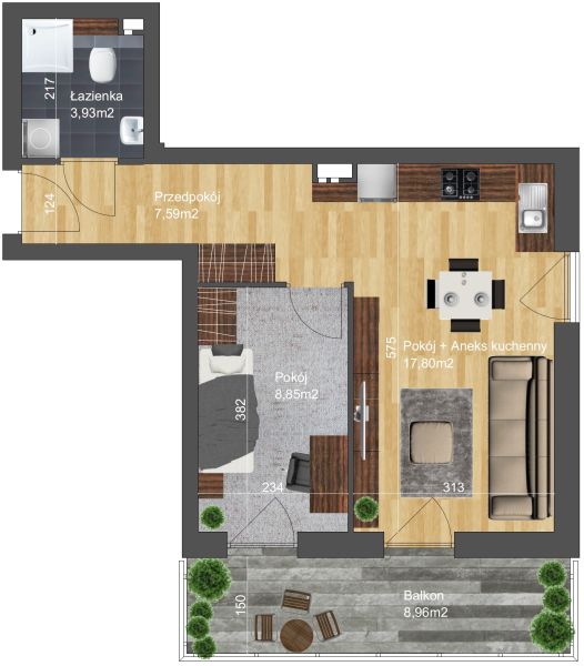 Powierzchnia użytkowa mieszkań liczona jest według normy PN-ISO 9836:1997 w stanie surowym. Na etapie projektu wykonawczego i realizacji obiektu mogą wystąpić korekty w powierzchni lokali i układzie ścian. Przedstawione elementy aranżacji mieszkania, materiały wykończeniowe, instalacje oraz urządzenia elektryczne, sanitarne i drzwi wewnętrzne nie stanowią wyposażenia lokalu, a ich rozmieszczenie jest przykładowe.